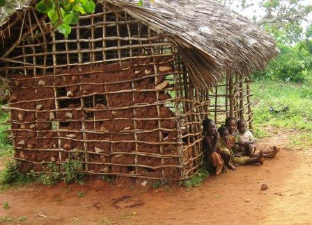 | das Dach wird mit Makuti gedeckt | und die Wände mit Lehm gefüllt |